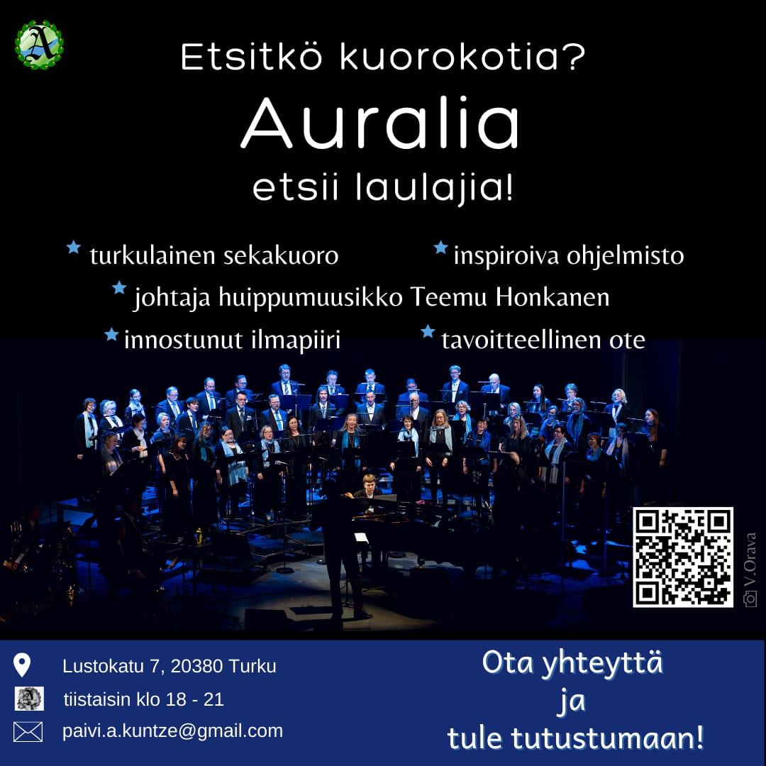 Kutkuttaako kuorolaulu? Haluaisitko olla osa Auralia-kuoroa? Haluaisitko laulaa tavoitteellisesti rennossa porukassa? Ehdit mukaan koelauluihin 24.1. ja 31.1.