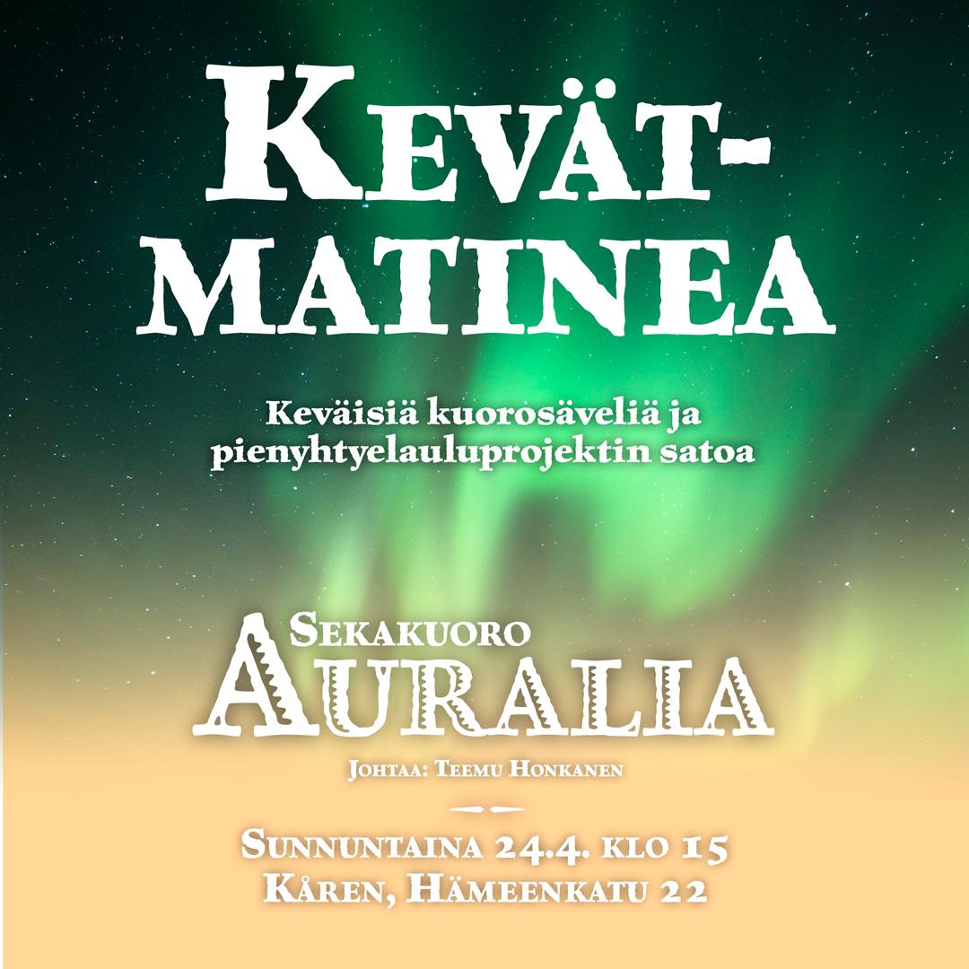 Tervetuloa siis keväiselle matkalle suomalaisen kuoromusiikin ytimeen! Auralia, entinen Sekakuoro Kulkuset, esittelee sekä tuttuja ja rakastettuja kuoroklassikoita alkaen Sibeliuksen Rakastava-sarjasta että pienryhmiemme taidonnäytteitä. Kevään kunniaksi kuulemme myös naiskuoroa ja mieskuoroa!