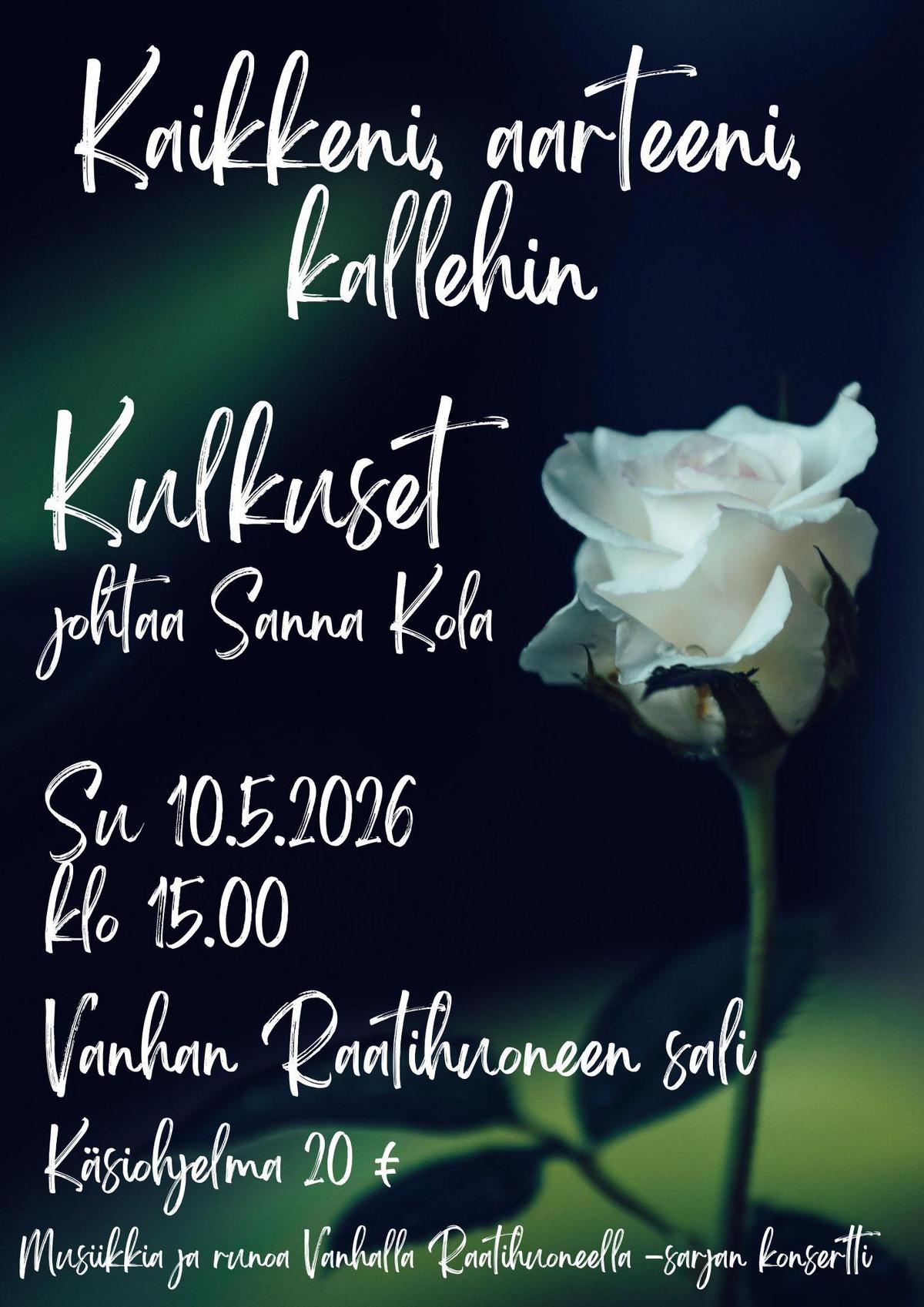 Äitienpäivän kunniaksi Kulkuset kajauttaa Vanhalla Raatihuoneella ilmoille vanhempia mutta myös joitakin uudempia, rakastetuimpia kuorosävelmiä. Kuoro esiintyy monin erilaisin ryhmin aina pienestä kvartetista suureen koko kuoron kokoonpanoon. Konsertissa kuullaan musiikkia mm. vanhoista suomifilmeistä ennakoiden ensi syksyn luentokonserttia. Ohjelmassa Kesäillan valssi, Romanssi elokuvasta Katariina ja Munkkiniemen kreivi, Sulle salaisuuden kertoa mä voisin ja monta muuta nostalgista ihanuutta.